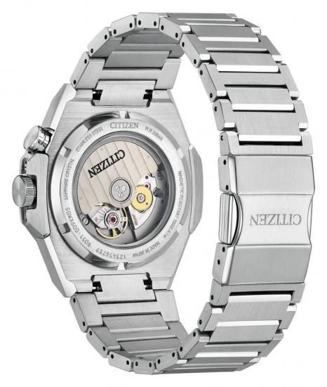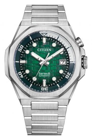 両回転インナーベゼルを採用し、文字板のシリーズエイトオリジナルパターン、テーパーをかけたメタルバンドの組み合わせが、スポーティな表情とともに都会的でラグジュアリーな印象を際立たせます。文字板には、「緑豊かなマリンリゾート」をモチーフに、海風に揺れる木々をイメージしたディープグリーンを配色しました。3体構造のセンターケース両サイドにガードパーツを組み合わせ、全体を5体構造で仕上げたエッジ感の強いケースデザインを採用。ヘアラインとミラーの複雑な磨き分けを施し、美しい質感を実現しました。2時位置にはインナーベゼル操作用のりゅうずを配置。回しやすさを考慮したサイズに設定しています。裏ぶたはムーブメントの鼓動を感じられるシースルーバック仕様。磁力による時刻のズレを防ぐシリーズエイトの基本性能「2種耐磁」も備えています。