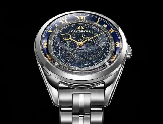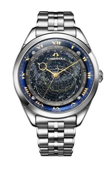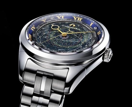 星の動きを精緻に再現した星座盤と、暗から明へのグラデーションで表現した見返しリング。