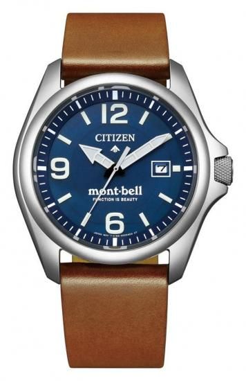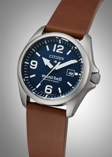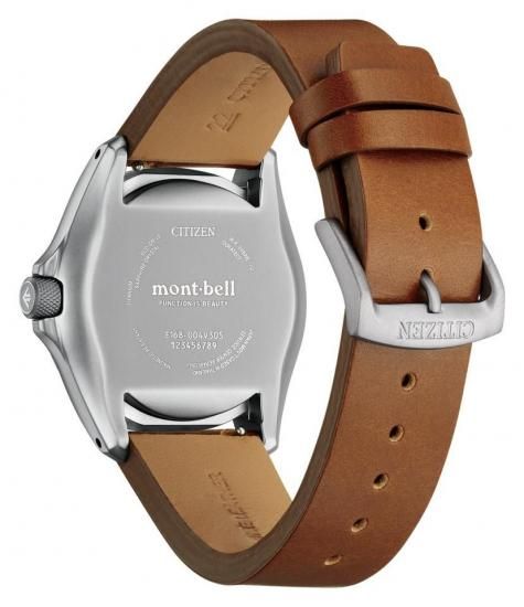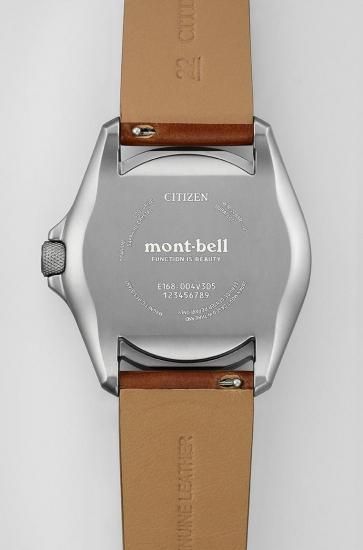 ダイバーズウオッチ用に開発されたCal.E168を搭載。アウトドアのハードな環境にも耐え抜くタフさ、昼夜問わない時刻の見やすさ、操作の簡単さといった、優れた実用性を備える1本です。ケースには打ちキズにも強いデュラテクトMRKを施しています。革バンドモデルは、シリコーンラバーバンド付属の2way仕様。ご自身でシーンに合わせて交換できるインターチェンジャブル構造です。裏ぶたレス構造のケースバックには、モンベルのブランドロゴをレーザー刻印。CITIZEN×mont-bellのロゴが入った専用ボックス付きです。