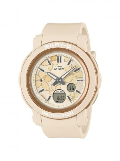 アクティブな女性に向けた耐衝撃・カジュアルウオッチBABY-Gから、フェイスに花柄をあしらったアナログウオッチです。