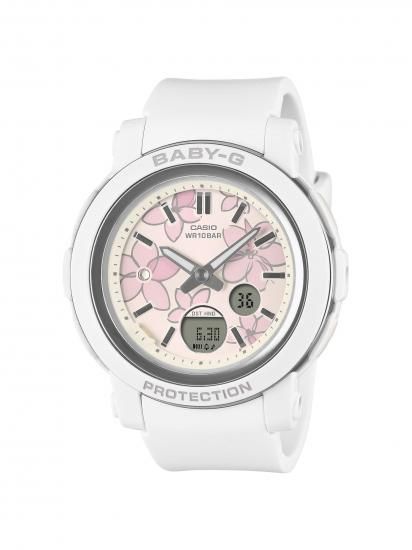 アクティブな女性に向けた耐衝撃・カジュアルウオッチBABY-Gから、フェイスに花柄をあしらったアナログウオッチです。