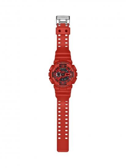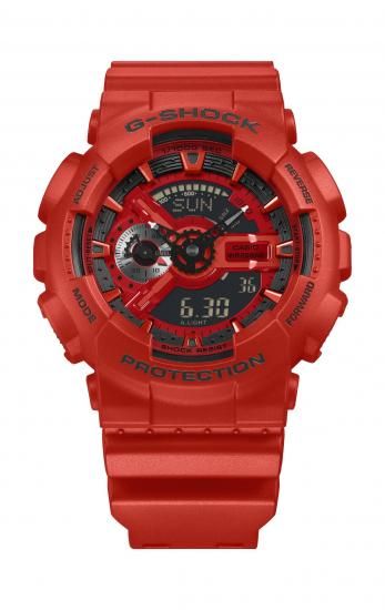 時計のフェイスに施された赤の色合いがバンドやベゼルと調和し、力強く質感のコントラストが印象的なデザインに仕上がっています。液晶は反転液晶で、各所にブラックを取り入れることでデザイン性を高めています。ブラックのアクセントカラーが赤を引き立て、G-SHOCKのアイデンティティを表現しています。